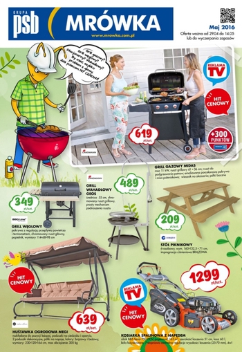 Nowa gazetka promocyjna PSB Mrówka. Polecane promocje z gazetki PSB Mrówka: Grill gazowy Midas - 619 zł. Grill wahadłowy Geos - 489 zł. Stół piknikowy 6-osobowy - 209 zł. Oferta ważna od 29.04 do 14.05 lub do…