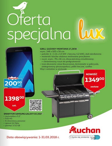 {loadposition linkAuchan} 'Oferta specjalna lux' - nowa gazetka promocyjna sieci marketów Auchan. Polecane promocje z gazetki Auchan: Smartfon Samsung Galaxy A5 2017 - 1398 zł. Grill gazowy Montana 17,2 kW - 1349 zł. Aparat natychmiastowy Fujifilm Instant Mini 9…