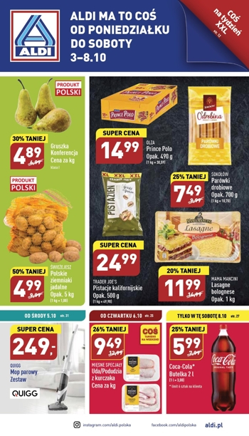{loadposition linkAldi2} 'Aldi ma to coś od poniedziałku do soboty' - nowa gazetka promocyjna sieci sklepów Aldi. Polecane promocje z gazetki Aldi: Gruszka konferencja 1 kg - 4,89 zł. Polskie ziemniaki jadalne 5 kg - 4,99 zł. Parówki drobiowe…