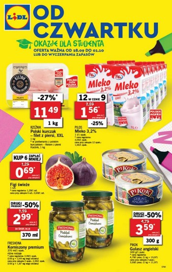 {loadposition linkLidl2} Nowa żółta gazetka promocyjna sieci sklepów Lidl - "Od czwartku okazje dla studenta". Polecane promocje z gazetki sklepów Lidl: Polski kurczak - filet z piersi XXL Rzeźnik 1 kg - 11,49 zł. Gulasz angielski Pikok…