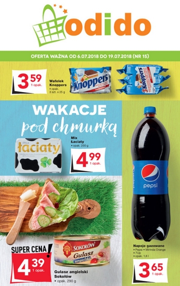 'Wakacje pod chmurką' - nowa gazetka promocyjna sklepów Odido. Polecane promocje z gazetki Odido: Gulasz angielski Sokołów 290 g - 4,39 zł. Mix Łaciaty 200 g - 4,99 zł. Wafelek Knoppers 3x25 g - 3,59 zł. …