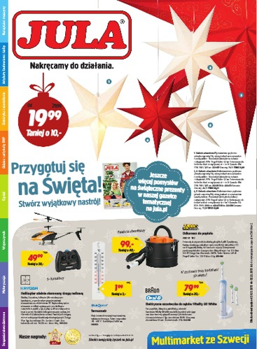 {loadposition linkJula} Nowa gazetka promocyjna sieci handlowej Jula. Polecane promocje z gazetki Jula: Helikopter zdalnie sterowany Kayoba - 49,99 zł. Termometr Kayoba - 1,99 zł. Odkurzacz kominkowy Kayoba 800 W 15 L - 99 zł. Oferta ważna od…
