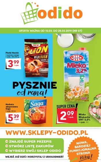 'Pysznie od rana!' - nowa gazetka promocyjna sklepów Odido. Polecane promocje z gazetki Odido: Płatki Nestle wybrane rodzaje - 3,99 zł. Herbata ekspresowa Saga 90 torebek - 5,39 zł. Mleko Mlekovita 1 L - 2,09 zł.…