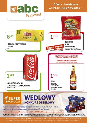 Nowa gazetka promocyjna sklepów ABC. Polecane promocje z gazetki ABC: Herbata ekspresowa Lipton 50 torebek - 6,49 zł. Cukierki Jumi 100 g - 1,09 zł. Piwo Tyskie 500 ml - 1,99 zł. Oferta ważna od 21.05 do…