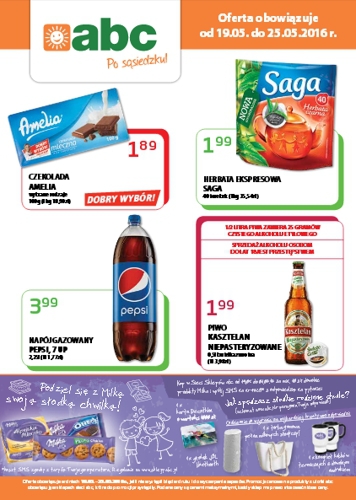 Nowa gazetka promocyjna sklepów ABC. Polecane promocje z gazetki ABC: Czekolada Amelia 100 g - 1,89 zł. Herbata ekspresowa Saga 40 torebek - 1,89 zł. Pepsi 2,25 L - 3,99 zł. Oferta ważna od 19.05 do 25.05…