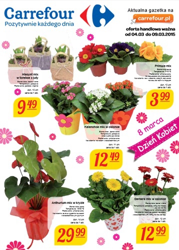 {loadposition linkCarrefour} Nowa gazetka promocyjna sieci handlowej Carrefour - "Kwiaty na Dzień Kobiet". Polecane promocje z gazetki Carrefour: Hiacynt mix w torebce z juty - 9,49 zł. Primula mix - 3,99 zł. Kalanchoe mix w osłonce - 12,49 zł.…