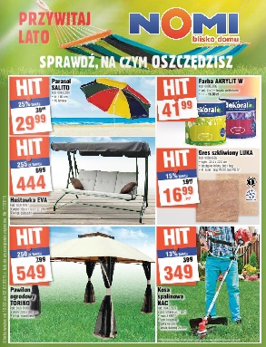 Nowa gazetka promocyjna Nomi - "Przywitaj lato". Polecane promocje z gazetki Nomi: Parasol SALITO - 29,99 zł. Huśtawka EVA - 444 zł. Pawilon ogrodowy TORINO - 549 zł. Oferta ważna od 19.06 do 2.07 lub do wyczerpania…
