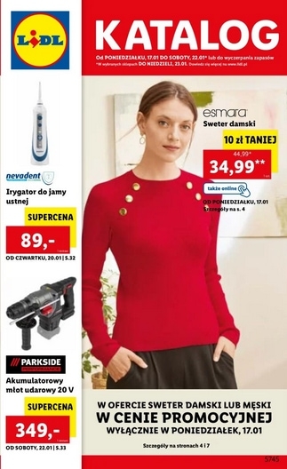Nowa gazetka promocyjna sieci sklepów Lidl. Polecane promocje z gazetki sklepów Lidl: Sweter damski Esmara - 34,99 zł. Irygator do jamy ustnej Nevadent - 89 zł. Akumulatorowy młot udarowy Parkside 20 V - 349 zł. Oferta ważna…