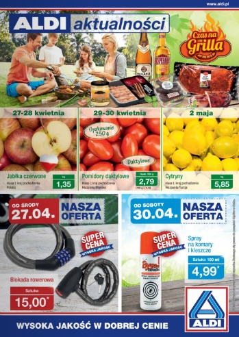 {loadposition linkAldi} Nowa gazetka promocyjna Aldi. Polecane promocje z gazetki Aldi: Blokada rowerowa - 15 zł. Spray na komary i kleszcze 100 ml - 4,99 zł. Jabłka czerwone 1 kg - 1,35 zł. Oferta ważna od 27.04 do…