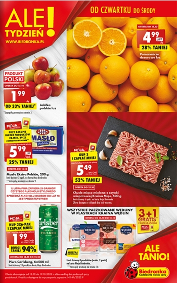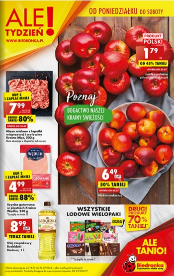 {loadposition linkBiedronka2} 'Ale tydzień!' - nowa gazetka promocyjna sieci sklepów Biedronka. Polecane promocje z gazetki sieci Biedronka: Pomarańcze deserowe 1 kg - 4,99 zł*. Jabłka polskie 1 kg - 1,99 zł*. Chude mięso mielone z szynki wieprzowej Kraina Mięs…