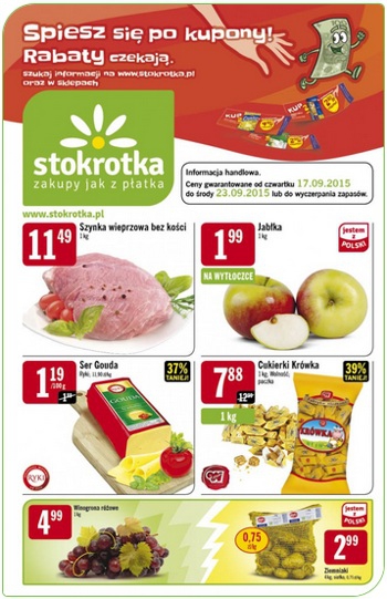 Nowa gazetka promocyjna sieci handlowej Stokrotka - "Spiesz się po kupony! Rabaty czekają". Polecane promocje z gazetki Stokrotka: Szynka wieprzowa bez kości 1 kg - 11,49 zł. Jabłka 1 kg - 1,99 zł. Ser Gouda 100 g -…