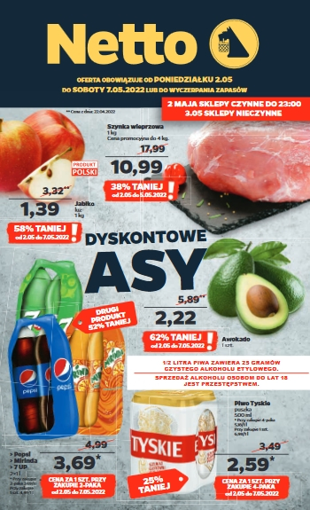 {loadposition linkNetto3} 'Dyskontowe asy' - nowa gazetka promocyjna sieci sklepów Netto. Polecane promocje z gazetki Netto: Jabłka 1 kg - 1,39 zł. Szynka wieprzowa 1 kg - 10,99 zł*. Awokado 1 sztuka - 2,22 zł. * - 38%…