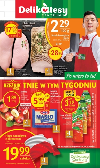 {loadposition linkDelikatesyCentrum} 'Rzeźnik cen tnie w tym tygodniu' - nowa gazetka promocyjna Delikatesów Centrum. Polecane promocje z gazetki Delikatesów Centrum: Filet z piersi kurczaka 1 kg - 17,99 zł*. Schab Benedykta Duda 100 g - 2,29 zł**. Jabłka 1…