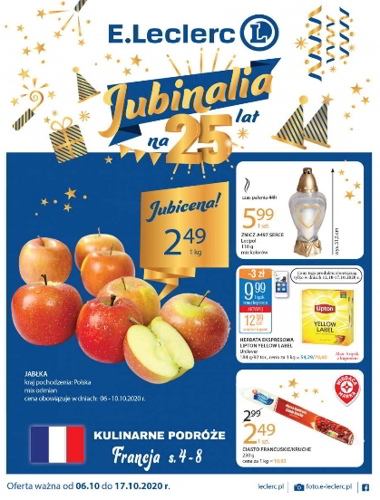 {loadposition linkEleclerc2} 'Jubinalia na 25 lat' - nowa gazetka promocyjna sieci handlowej E.Leclerc. Polecane promocje z gazetki E.Leclerc: Jabłka 1 kg - 2,49 zł. Znicz Serce Ledpol 44h 110 g - 5,99 zł. Herbata ekspresowa Lipton Yellow Label 92…