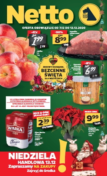 'Bezcenne święta dla wszystkich' - nowa gazetka promocyjna sieci sklepów Netto. Polecane promocje z gazetki Netto: Jabłka 1 kg - 1,99 zł. Łopatka wieprzowa 1 kg - 8,99 zł. Kapusta kiszona Przysmaki Gospody 3 kg - 6,99 zł. …