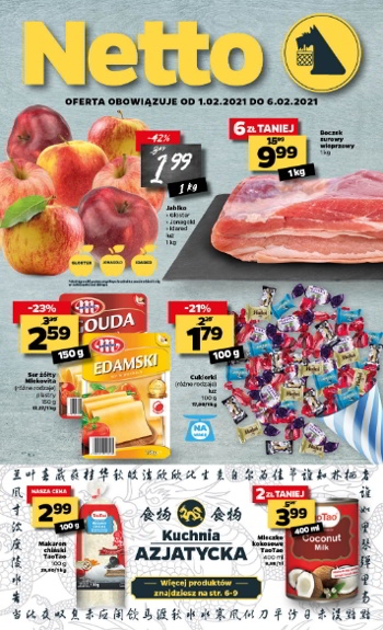Nowa gazetka promocyjna sieci sklepów Netto. Polecane promocje z gazetki Netto: Jabłka 1 kg - 1,99 zł. Boczek surowy wieprzowy 1 kg - 9,99 zł. Ser żółty Mlekovita 150 g - 2,59 zł. Oferta ważna od poniedziałku…
