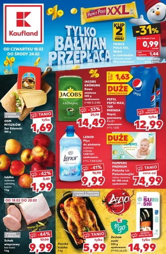 'Tylko bałwan przepłaca' - nowa gazetka promocyjna sieci marketów Kaufland. Polecane promocje z gazetki Kaufland: Kawa mielona Jacobs Kronung 500 g - 14,49 zł. Płyn do płukania Lenor 1,42 L - 9,99 zł. Jabłka 1 kg - 1,99 zł.…