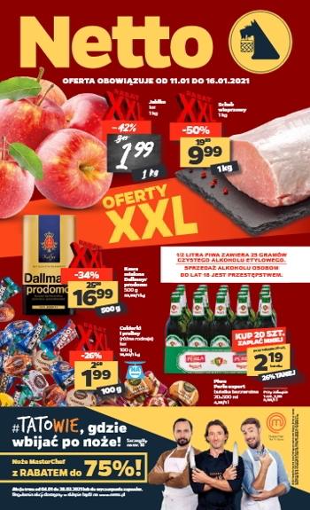 'Oferty XXL' - nowa gazetka promocyjna sieci sklepów Netto. Polecane promocje z gazetki Netto: Jabłka 1 kg - 1,99 zł. Schab wieprzowy 1 kg - 9,99 zł. Kawa mielona Dallmayr Prodomo 500 g - 16,99 zł. Oferta…