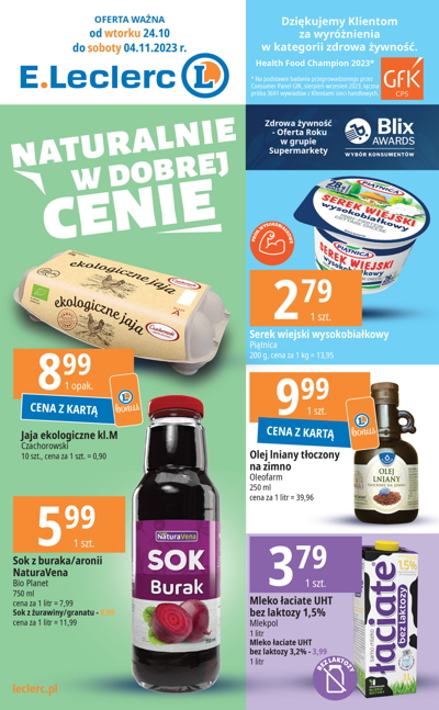 {loadposition linkEleclerc3} 'Zdrowie w cenie my to mamy!' - nowa gazetka promocyjna sieci handlowej E.Leclerc. Polecane promocje z gazetki E.Leclerc: Mleko Łaciate bez laktozy 1 L - 3,49 zł. Jaja ekologiczne Czachorowski klasa M 10 sztuk - 7,99 zł*.…