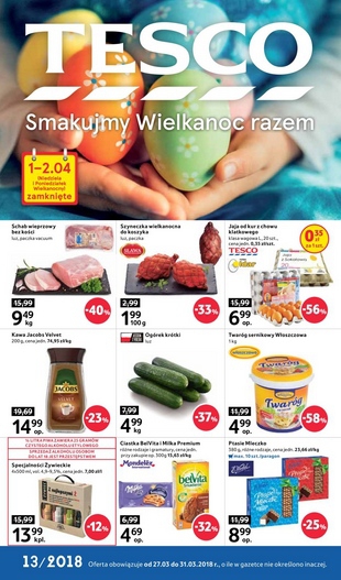 'Smakujmy Wielkanoc razem' - nowa gazetka promocyjna sieci sklepów Tesco. Polecane promocje z gazetki Tesco: Schab wieprzowy bez kości 1 kg - 9,49 zł. Szyneczka wielkanocna do koszyka Sława 100 g - 1,99 zł. Jaja od kur z…
