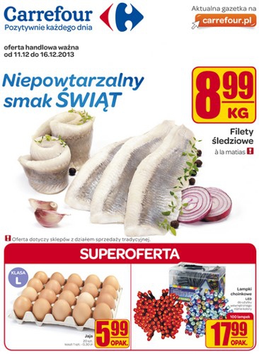 {loadposition linkCarrefour} Nowa gazetka promocyjna sieci handlowej Carrefour - "Niepowtarzalny smak Świąt". Polecane promocje z gazetki Carrefour: Filety śledziowe a la Matias 1 kg - 8,99 zł. Jaja klasa L 20 sztuk - 5,99 zł. Lampki choinkowe LED -…