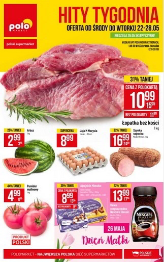 {loadposition linkPoloMarket} 'Hity tygodnia' - nowa gazetka promocyjna sieci sklepów Polo Market. Polecane promocje z gazetki Polo Market: Łopatka bez kości 1 kg - 10,99 zł*. Arbuz 1 kg - 2,99 zł. Jaja Marysia klasa M 30…