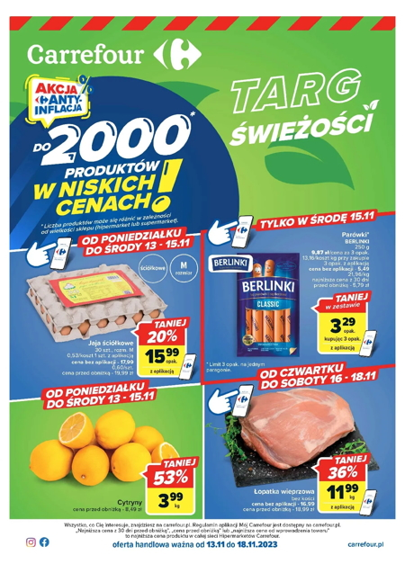 {loadposition linkCarrefour3} 'Do 2000 produktów w niskich cenach! Targ świeżości' - nowa gazetka promocyjna sieci marketów Carrefour. Polecane promocje z gazetki Carrefour: Jaja ściółkowe klasa M 30 sztuk - 15,99 zł*. Parówki Berlinki Morliny 250 g - 3,29 zł**.…