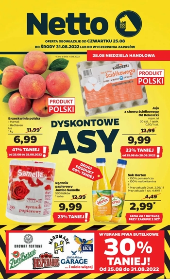 {loadposition linkNetto} 'Dyskontowe asy' - nowa gazetka promocyjna sieci sklepów Netto. Polecane promocje z gazetki Netto: Brzoskwinia polska Harnaś 1 kg - 6,99 zł*. Jaja z chowu ściółkowego Od Kokoszki klasa M 20 sztuk - 9,99 zł*. Sok Hortex…