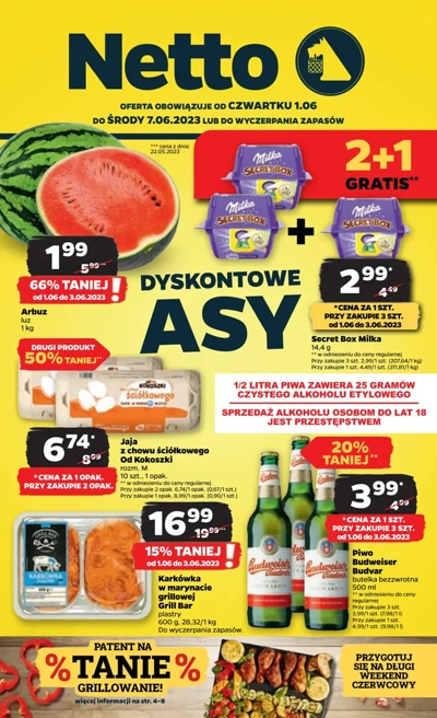 {loadposition linkNetto5} 'Dyskontowe asy' - nowa gazetka promocyjna sieci sklepów Netto. Polecane promocje z gazetki Netto: Arbuz 1 kg - 1,99 zł*. Secret Box Milka 14,4 g - 2,99 zł**. Jaja z chowu ściółkowego Od Kokoszki klasa M 10…