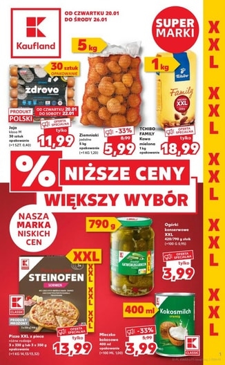 {loadposition linkKaufland2} 'Niższe ceny, większy wybór' - nowa gazetka promocyjna sieci marketów Kaufland. Polecane promocje z gazetki Kaufland: Jaja Zdrovo klasa M 30 sztuk - 11,99 zł. Ziemniaki 5 kg - 5,99 zł. Kawa mielona Tchibo Family 1 kg…