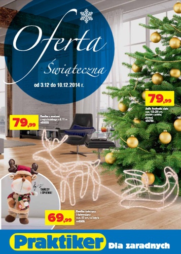 Nowa gazetka promocyjna Praktiker - "Oferta świąteczna". Polecane promocje z gazetki Praktiker: Jodła kaukaska cięta wysokość 150-200 cm - 79,99 zł. Renifer z saniami z węża świetlnego o długości 11 m - 79,99 zł. Renifer tańczący i śpiewający…