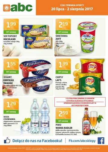 Nowa gazetka promocyjna sklepów ABC. Polecane promocje z gazetki ABC: Ser topiony Hochland 100 g - 1,99 zł. Jogurt Danone Fantasia różne rodzaje - 1,55 zł. Śmietanka Zott 200 g - 2,19 zł. Oferta ważna…