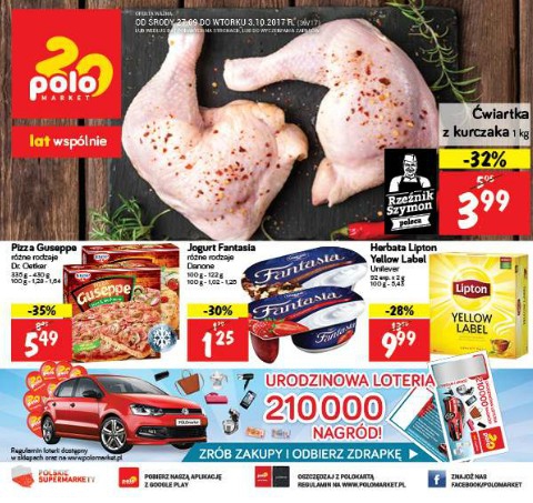 {loadposition linkPoloMarket} Nowa gazetka promocyjna Polo Market. Polecane promocje z gazetki Polo Market: Ćwiartka z kurczaka 1 kg - 3,99 zł. Pizza Guseppe różne rodzaje - 5,49 zł. Jogurt Danone Fantasia 122 g - 1,25 zł.…