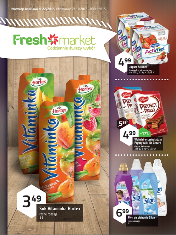 {loadposition linkFreshmarket} Nowa gazetka promocyjna Freshmarket. Polecane promocje z gazetki Freshmarket: Sok Hortex Vitaminka 1 L - 3,49 zł. Jogurt Danone Actimel 4x100 g - 4,99 zł. Płyn do płukania Silan 1 L - 6,99 zł. Oferta ważna…