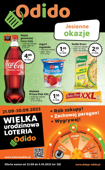 {loadposition linkOdido} 'Jesienne okazje' - nowa gazetka promocyjna sklepów Odido. Polecane promocje z gazetki Odido: Napój gazowany Coca-Cola 850 ml - 4,89 zł. Jogurt Jogobella 150 g - 1,49 zł. Nudle Knorr wybrane rodzaje - 2,35 zł. …