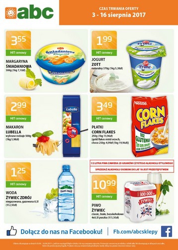 Nowa gazetka promocyjna sieci sklepów ABC. Polecane promocje z gazetki ABC: Margaryna Śniadaniowa 500 g - 3,55 zł. Jogurt naturalny Zott 370 g - 1,99 zł. Płatki Corn Flakes 250 g - 3,49 zł. …