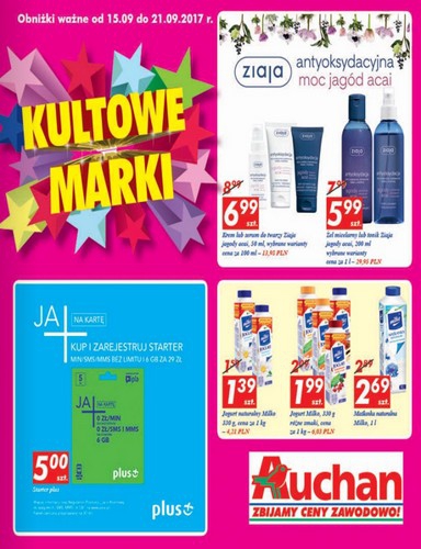 {loadposition linkAuchan} Nowa gazetka promocyjna Auchan - "Kultowe marki". Polecane promocje z gazetki Auchan: Żel micelarny lub tonik Ziaja jagody acai 200 ml - 5,99 zł. Jogurt naturalny Milko 330 g - 1,39 zł. Sałatka z kurczakiem Dega…