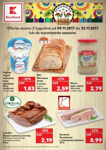 {loadposition linkKaufland} Nowa gazetka promocyjna marketu Kaufland - "Regionalna półka". Polecane promocje z gazetki Kaufland: Jogurt naturalny typu greckiego FigAnd 400 g - 1,83 zł. Seler wiórki Mosso 300 g - 2,79 zł. Boczek wędzony parzony Lukullus 100 g…