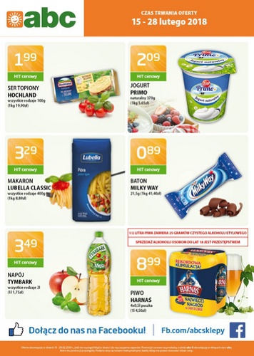Nowa gazetka promocyjna sieci sklepów ABC. Polecane promocje z gazetki ABC: Ser topiony Hochland 100 g - 1,99 zł. Jogurt naturalny Zott Primo 370 g - 2,09 zł. Napój Tymbark 2 L - 3,49 zł. …