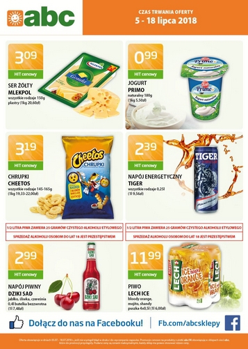 Nowa gazetka promocyjna sieci sklepów ABC. Polecane promocje z gazetki ABC: Ser żółty Mlekpol 150 g - 3,09 zł. Jogurt naturalny Zott Primo 180 g - 0,99 zł. Chrupki Cheetos 145 g - 3,19 zł. Oferta…