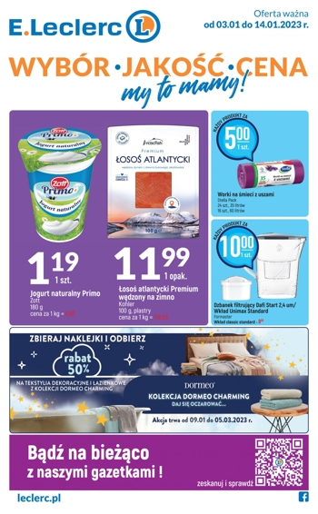 {loadposition linkEleclerc3} 'Wybór, jakość, cena, may to mamy!' - nowa gazetka promocyjna sieci handlowej E.Leclerc. Polecane promocje z gazetki E.Leclerc: Jogurt naturalny Zott Primo 180 g - 1,19 zł. Łosoś atlantycki wędzony na zimno Kohler Premium 100 g -…