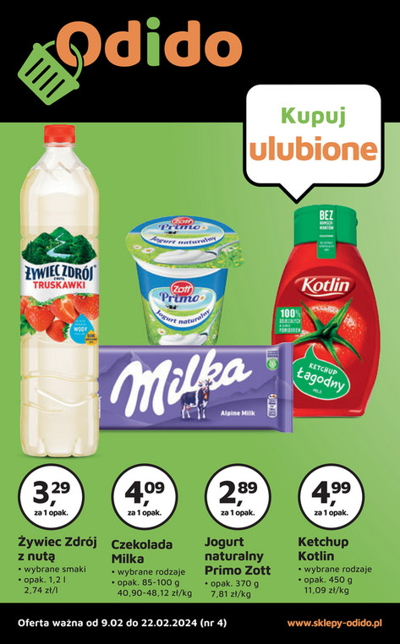 'Kupuj ulubione' - nowa gazetka promocyjna sklepów Odido. Polecane promocje z gazetki Odido: Żywiec Zdrój z nutą truskawki 1,2 L - 3,29 zł. Czekolada Milka 100 g - 4,09 zł. Jogurt naturalny Zott Primo 370 g - 2,89 zł.…