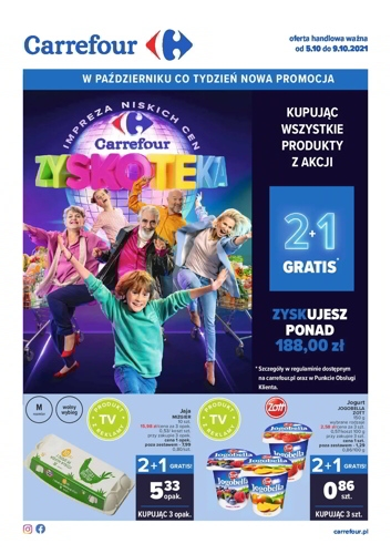{loadposition linkCarrefour6} 'Zyskoteka - impreza niskich cen' - nowa gazetka promocyjna sieci marketów Carrefour. Polecane promocje z gazetki Carrefour: Jaja z chowu na wolnym wybiegu Mizgier 3x10 sztuk - 15,98 zł. Jogurt Zott Jogobella 3x150 g - 2,58 zł.…