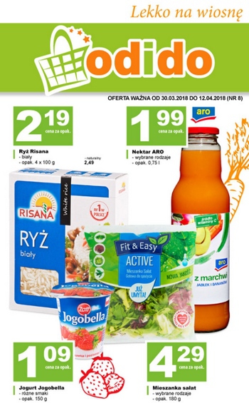 'Lekko na wiosnę' - nowa gazetka promocyjna sklepów Odido. Polecane promocje z gazetki Odido: Ryż Risana 4x100 g - 2,19 zł. Nektar Aro 750 ml - 1,99 zł. Jogurt Jogobella 150 g - 1,09 zł. Oferta…