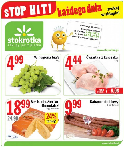 Nowa gazetka promocyjna sieci handlowej Stokrotka - "sTOP HIT!". Polecane promocje z gazetki Stokrotka: Winogrono białe 1 kg - 4,99 zł. Ćwiartka z kurczaka 1 kg - 4,44 zł. Kabanosy drobiowe 1 kg - 9,99 zł. Oferta…