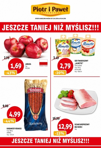 Nowa gazetka promocyjna sieci sklepów Piotr i Paweł - "Jeszcze taniej niż myślisz!!!". Polecane promocje z gazetki Piotr i Paweł: Jabłka 1 kg - 1,69 zł. Ser twarogowy Hochland Almette 150 g - 2,79 zł. Kabanosy Krakus 180…