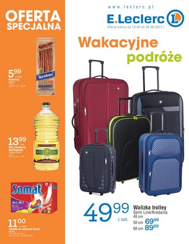 {loadposition linkEleclerc} Nowa gazetka promocyjna sieci handlowej E.Leclerc - "Wakacyjne podróże". Polecane promocje z gazetki E.Leclerc: Walizka trolley - 49,99 zł. Kabanosy Krakus 180 g - 5,99 zł. Olej rzepakowy Wielkopolski 3 L - 13,99 zł.…