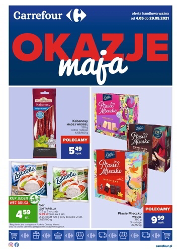 {loadposition linkCarrefour8} 'Okazje maja' - nowa gazetka promocyjna sieci marketów Carrefour. Polecane promocje z gazetki Carrefour: Kabanosy Madej Wróbel 120 g - 5,49 zł. Ser Zottarella 2x125 g - 5,59 zł. Ptasie mleczko Wedel 360 g - 9,99 zł.…