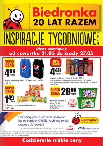 {loadposition linkBiedronka} Nowa gazetka promocyjna sieci handlowej Biedronka - "Inspiracje Tygodniowe". Polecane promocje z gazetki sieci Biedronka: Kabanosy Maestro Henryk Kania 120 g - 4,49 zł. Galaretka z nadzieniem Fresh&Fruity 100 g - 1,49 zł. Kapsułki do prania Ariel…