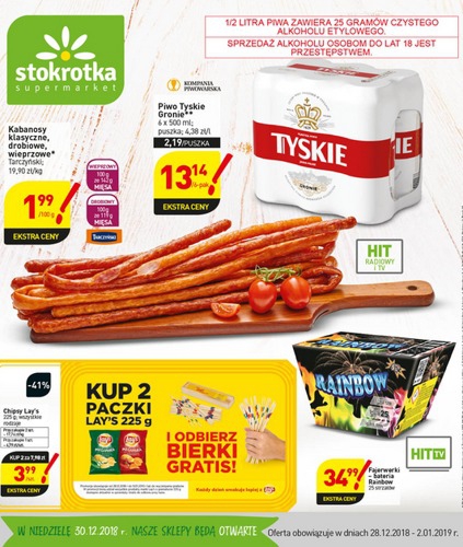 Nowa gazetka promocyjna sieci sklepów Stokrotka. Polecane promocje z gazetki Stokrotka: Kabanosy Tarczyński 100 g - 1,99 zł. Piwo Tyskie 6x500 ml - 13,14 zł. Bateria Rainbow - 34,99 zł. Oferta ważna od 28.12.2018 do…